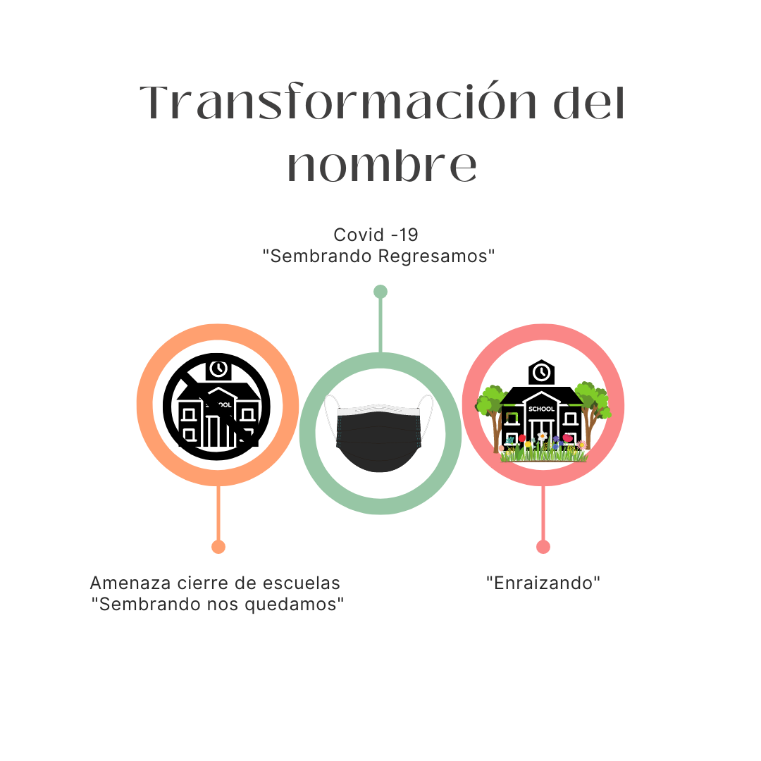 Enraizado viene del verbo enraizar, extender sus raíces, acomodarse. Para el proyecto también simboliza la etapa de crecimiento en la que se encuentra. Al igual que para los niños y niñas, quienes ya han tenido años trabajando en estos espacios y es tiempo de verles echar raíces, acostumbrándose a estos espacios en la escuela y a su comunidad luego del regreso por la pandemia.