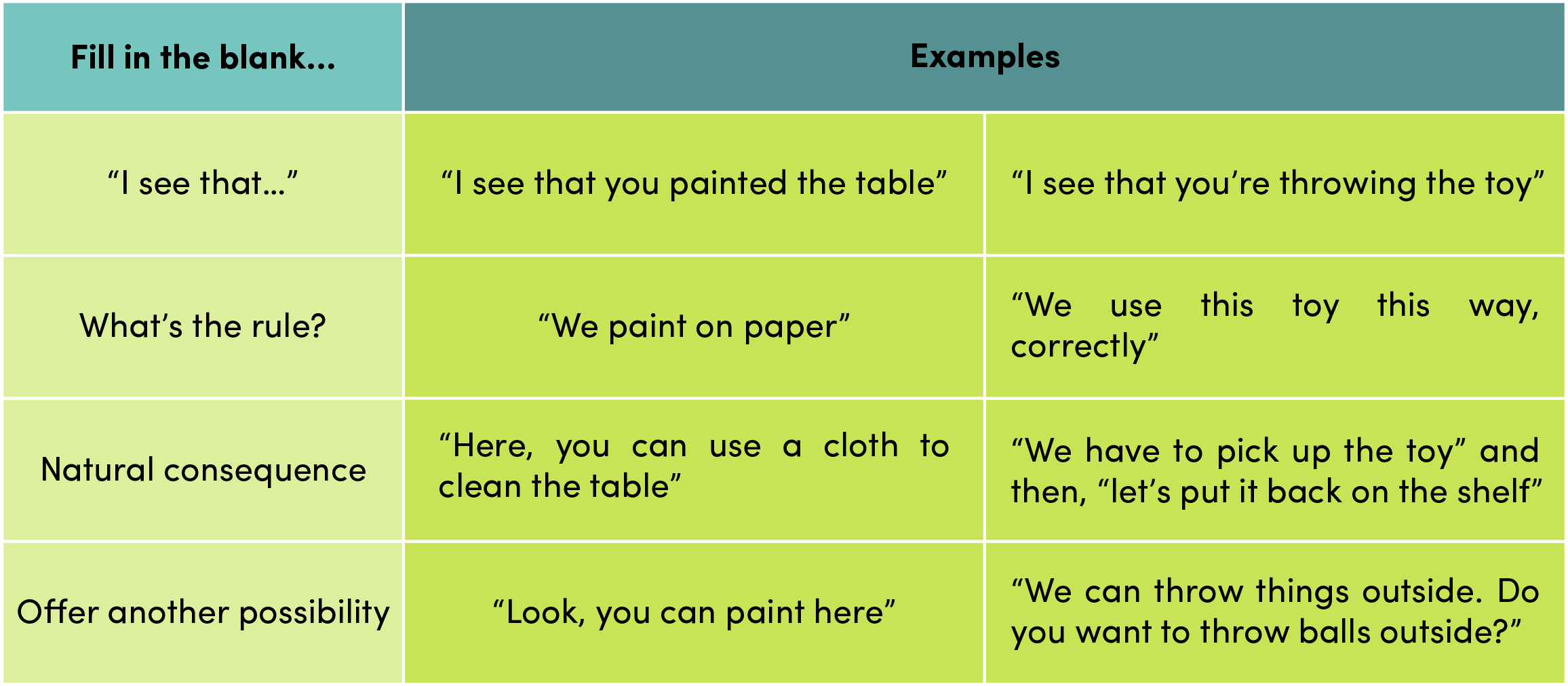 Positively redirecting children means guiding them toward acceptable ways to act and work. We use the word “positive” because instead of over-using the word “no,” we use positive language: we guide the toddler toward what he can do.