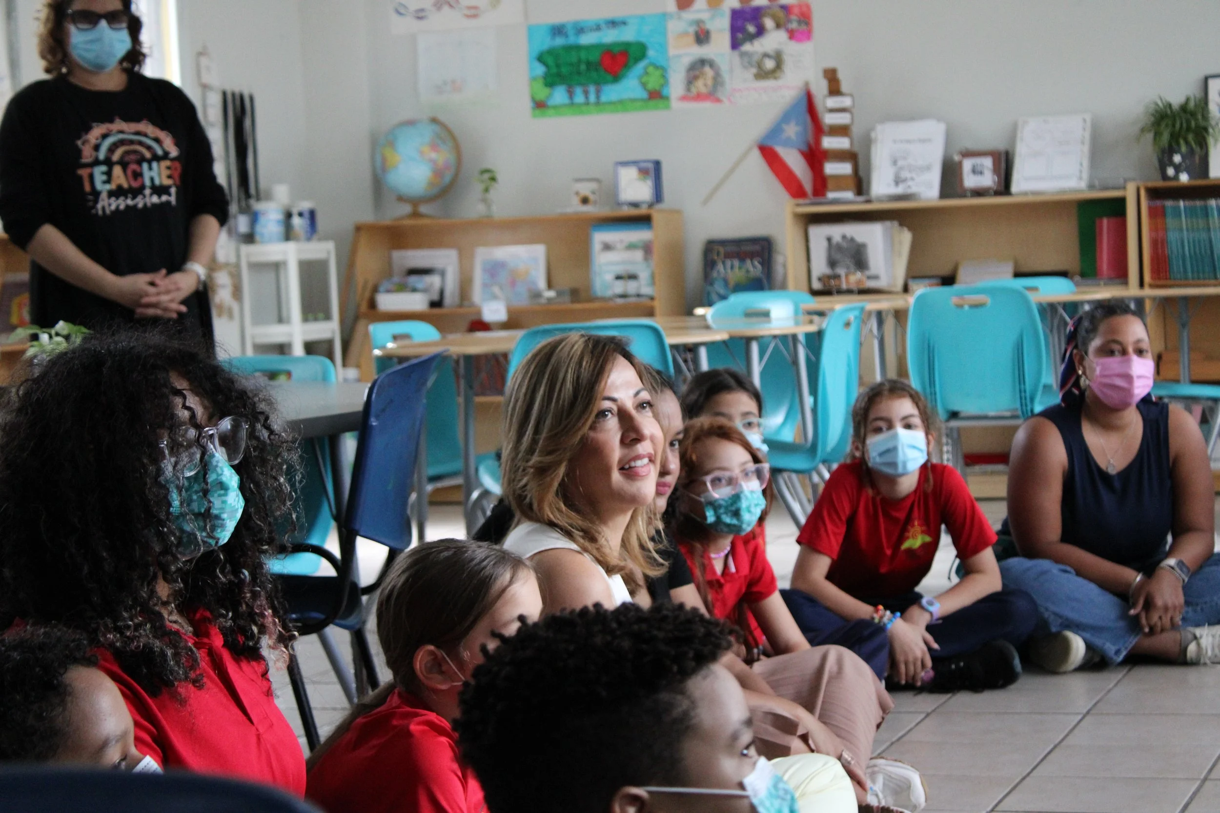 Journalist Sonia Valentín participates in the community assembly in a Montessori Workshop II setting. The assembly takes place in the morning and afternoon among students, guides, and Montessori assistants to foster connection.