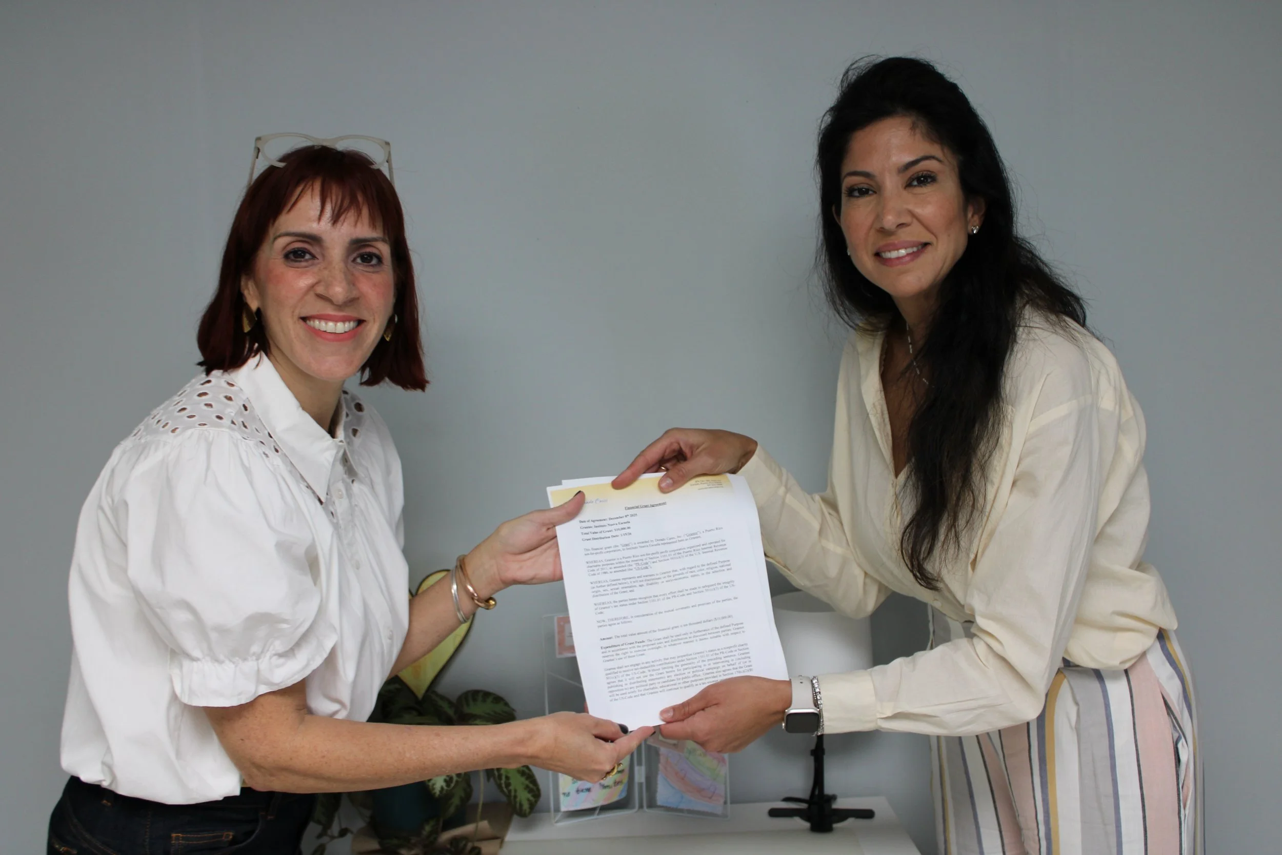 Dorados Cares awards a grant to INE to further strengthen the public Montessori school project. In the photo, from left to right: Jennyffer Otero, executive director of INE, and Josie Yousef, of Dorados Cares.
